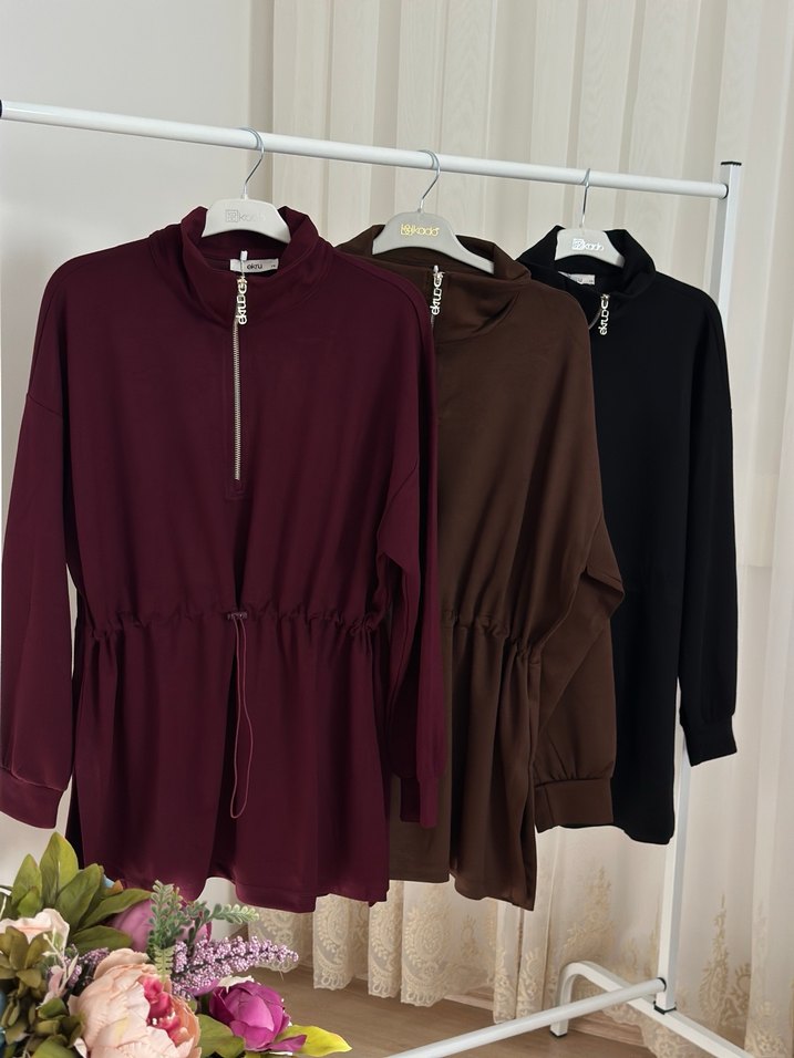 Uzun kollu, yarım fermuarlı ve yüksek yakalı bu kadın tunik, yumuşak pamuklu 2 iplik kumaştır. BORDO-KAHVE-SİYAH renkleri mevcuttur.. Sm ml lx şekliinde bedenli. 38-46 arası uyumlu