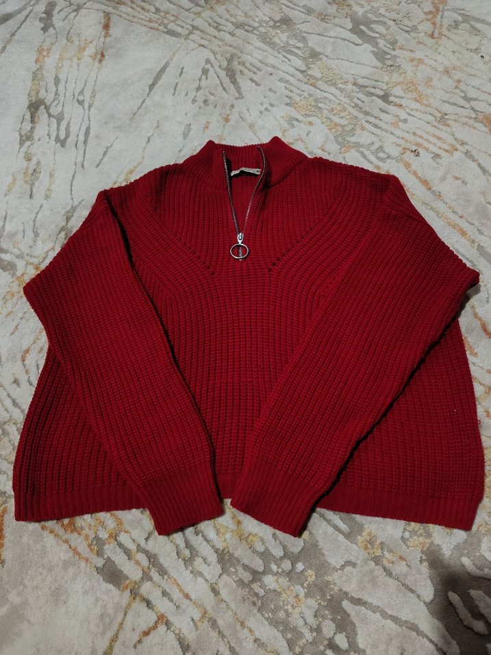 Bordo renkli örgü kadın kazak, yarım fermuarlı yüksek yakaya, uzun kollara ve bol kesime sahiptir. Rahat sokak stili için uygundur. Hiç kullanılmadı.