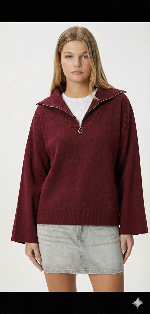 Bordo Yarım Fermuarlı Yüksek Yaka Kadın kazak