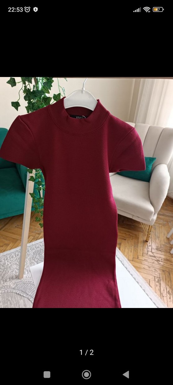 Bordo renkte, yarım kollu ve yüksek yakalı, ince dokuma sentetik kumaştan yapılmış, normal midi boyda, dar kesim hamile tişörtü. Günlük sokak stiline uygun.