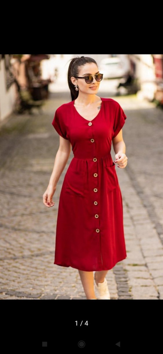 Bordo yazlık V Yaka Düğmeli midi Elbise