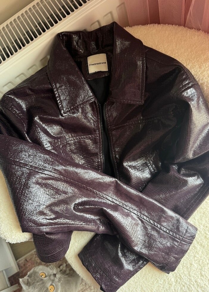 Bordo yılan derisi desenli, düğmeli ve kesik yakalı, uzun kollu, dar kesim deri ceket. Şehir stiline uygun şık bir parça. Bir kaç kere giydim dolabımı yeniliyorum