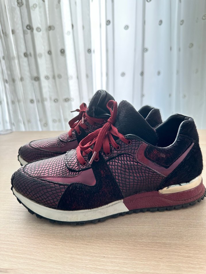 Bordo yılan desenli ve bağcıklı spor ayakkabısı. 37 numara, çok rahat