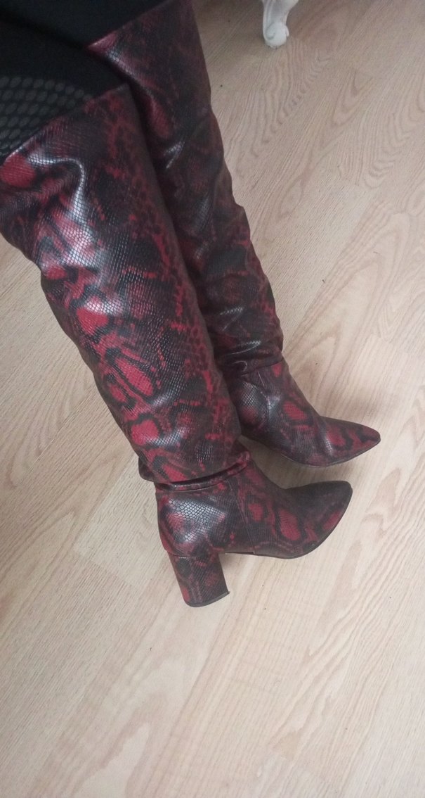 Bordo renkli, koyu yılan desenli deri tam siz kapigina kadar gelen çizme ,ici polarli sıcak tutuyor kalın topuklu tasarıma sahiptir. Günlük kullanıma uygun, cesur ve gotik stil sunar. bir kez kullandım yeni gibi