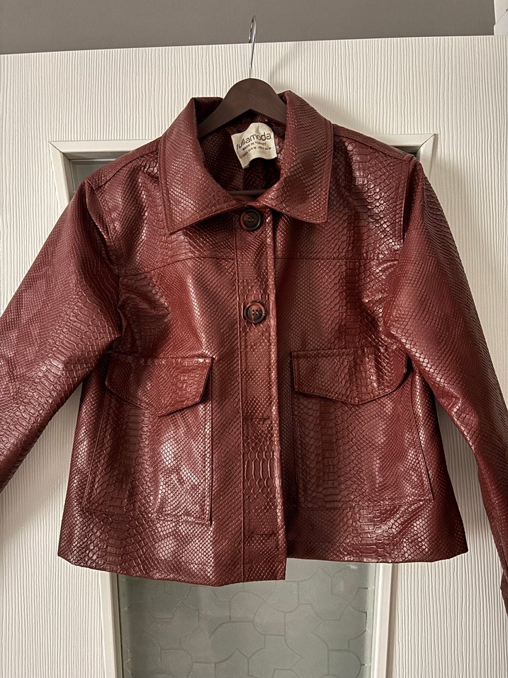 M beden İki koltuk arası 51 cm Uzunluk 51 cm Bordo yılan desenli deri ceket, düğmeli ön ve kesik yakaya sahiptir. Uzun kollu, normal kesim ve midi boydadır. Günlük sokak tarzına uygundur.