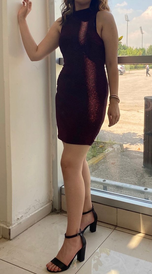 Bordo renkli, yılan desenli, örgü dokulu, kolsuz ve yüksek yakalı midi elbise. Trendy ve rahat bir görünüm için idealdir.