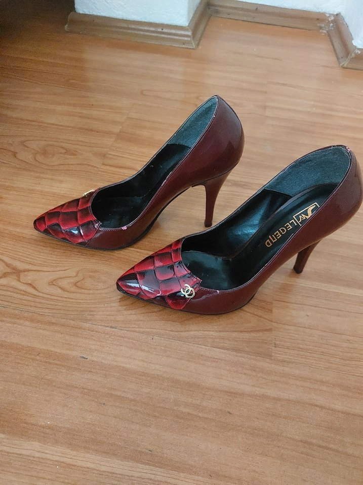 Koyu bordo, yılan desenli ve tokalı, kauçuk malzemeden yapılmış stiletto. Romantik akşamlar için uygundur.
