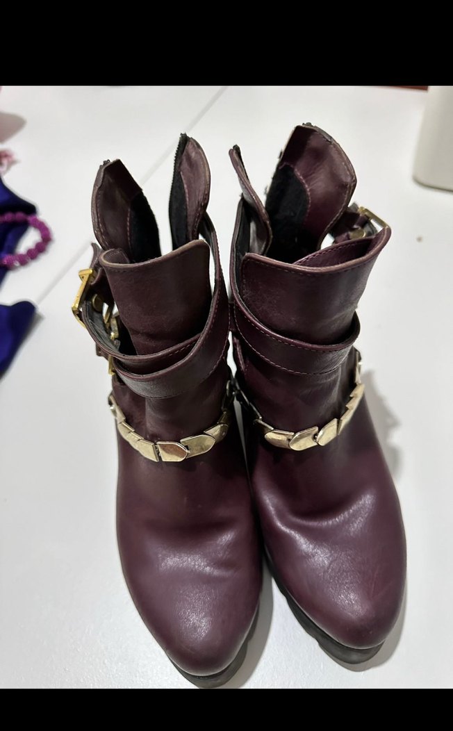 Bordo deri yılan desenli biker botlar, tokalı kayışlar ve yüksek topuklu tasarımıyla dikkat çekiyor.