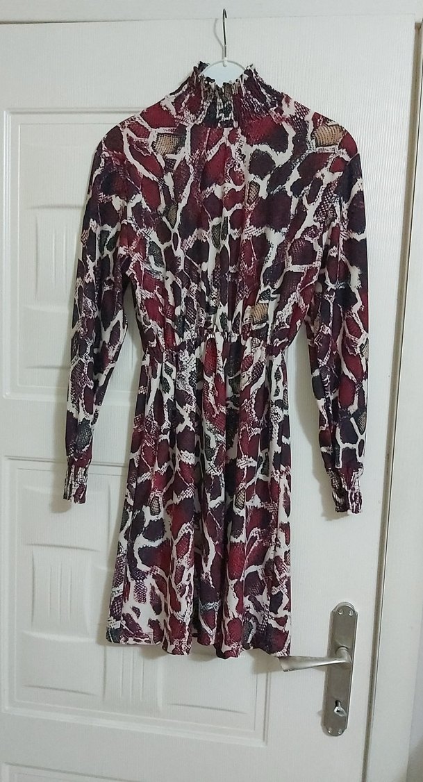 Bordo yılan desenli, uzun kollu, yüksek yakalı ve düğmeli bohem tarzda dar kesim elbise. Sentetik kumaştan üretilmiştir.