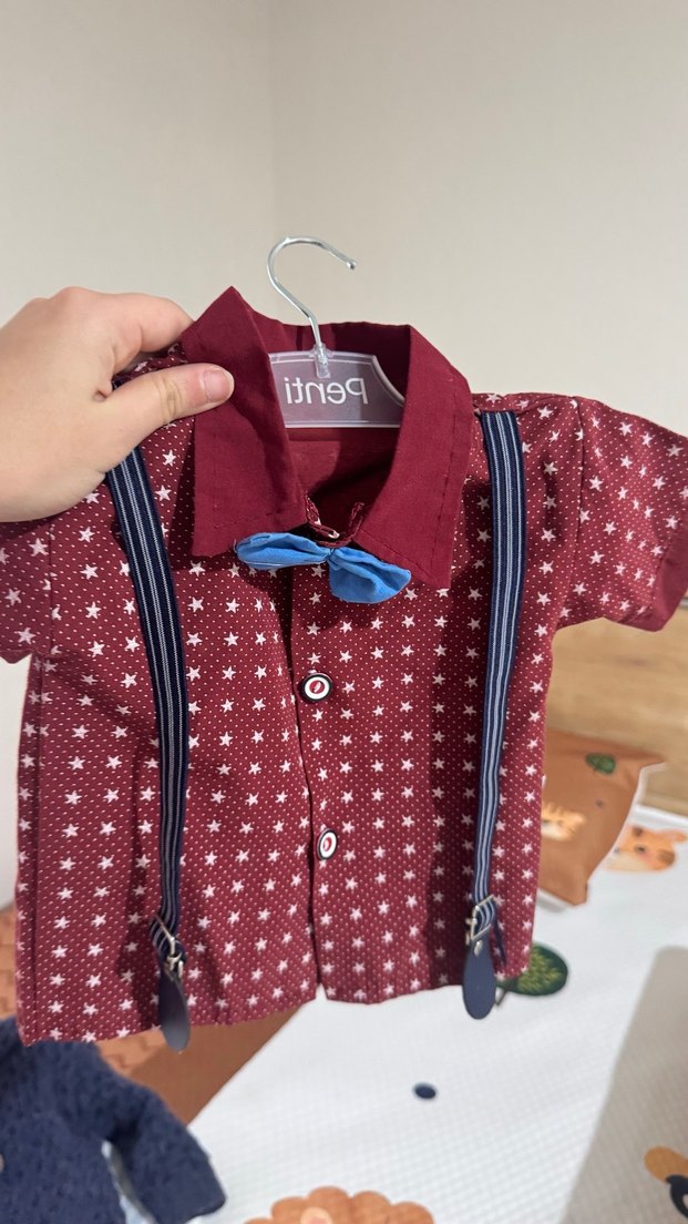 Bordo renkli, kısa kollu, yıldız desenli bebek gömleği; yakası notched lapel, düğmeli ve mavi papyon detaylı, askılı şık tasarım. ⭐
