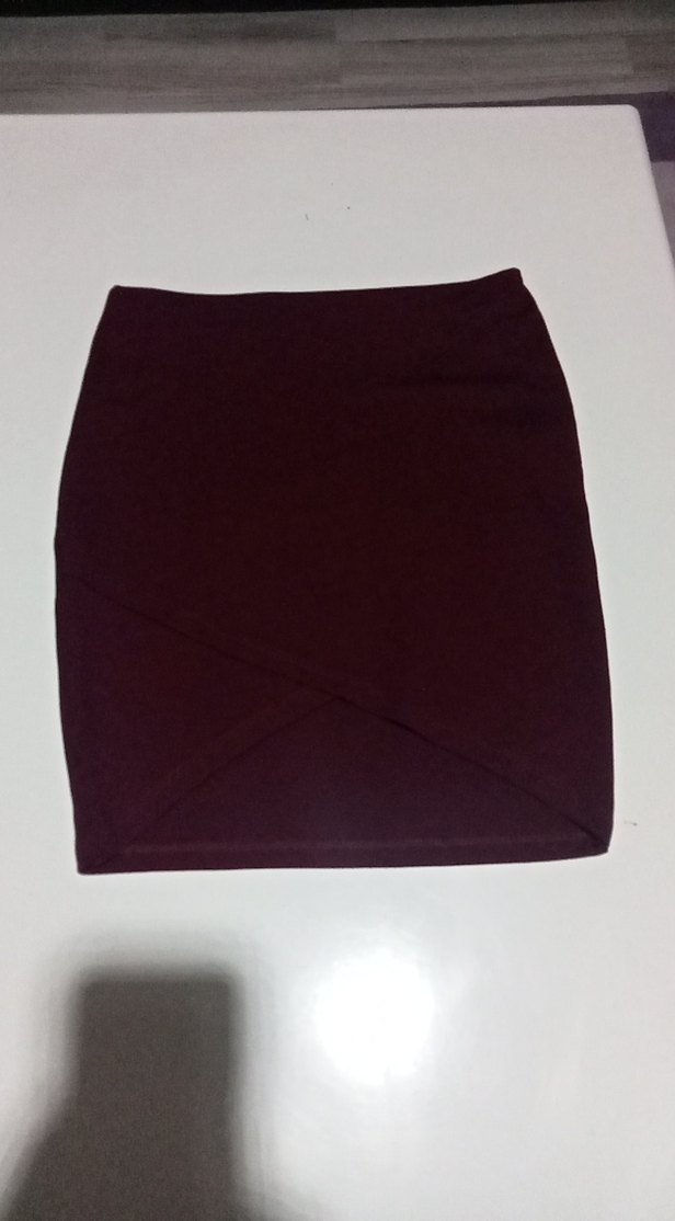Bordo renkli, düz ve kalem kesim midi etek, yumuşak sentetik kumaştan, ofis için sade ve şık bir tercih. Düşük bel.