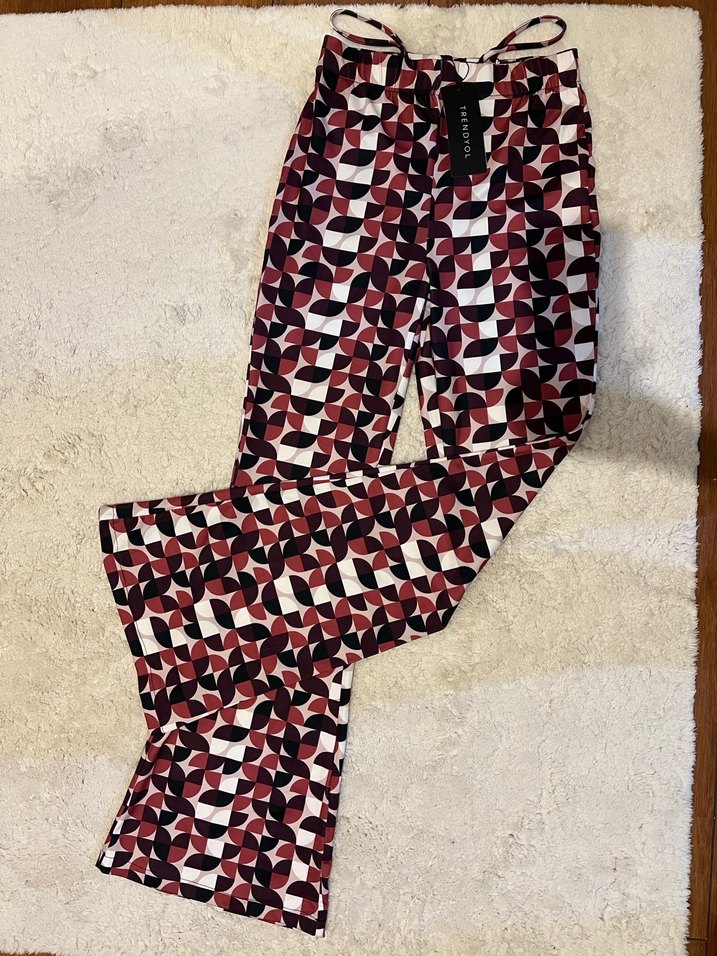 SIFIR ETİKETLİ Trendyolmilla- Bordo renkli kadın ispanyol paça pantolon, rahat sentetik kumaştan, çağdaş bağlama deseniyle günlük kullanıma uygun (spor). Esnek.