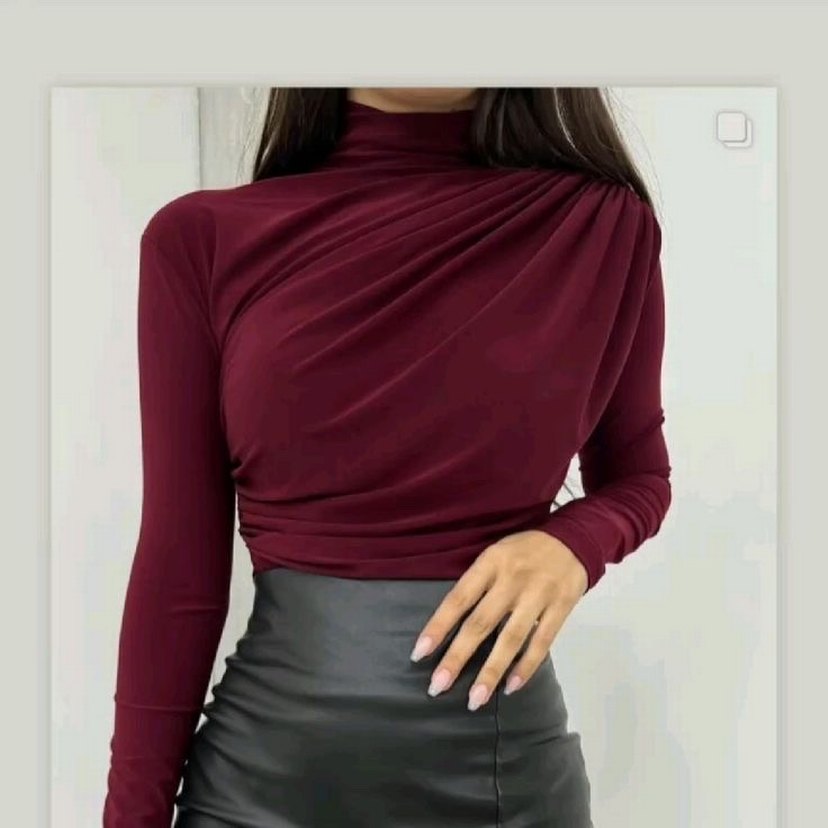 Dar kesim kadın bluz, yüksek yakalı ve uzun kolludur. Pürüzsüz sentetik kumaştan yapılmış, bordodur ve drapeli detaylarla çağdaş bir görünüm sunar. Minimalist, desensiz tasarımı günlük kullanıma uygundur.