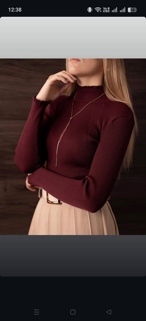 Bordo renkli, yüksek yakalı, fitilli ve pileli uzun kollu kadın kazak, günlük sokak stiline uygun.