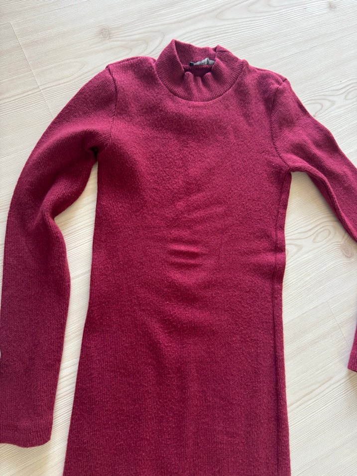 Bordo renkte, yüksek yakalı ve uzun kollu, yumuşak ve sıcak dokulu triko elbise. Sade ve düz tasarımıyla uzun ve rahat bir kesime sahiptir.