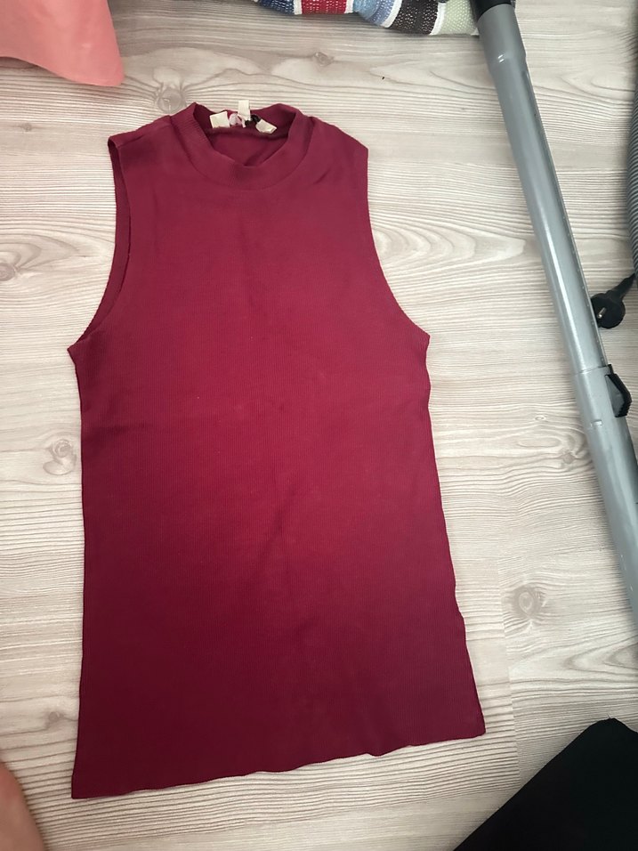 Bordo renkte, kolsuz ve yüksek yakalı kadın süveteri. İnce kesimi ve midi boyu ile günlük kullanıma uygun, rahat ve şık bir parça.