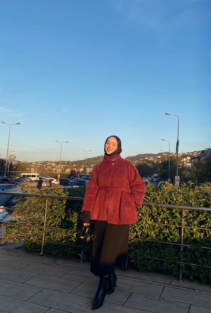 Bordo renkli, yüksek yakalı ve uzun kollu midi kaban 1 kere giyildi cepli kemerli kürk kaban içi astarlı