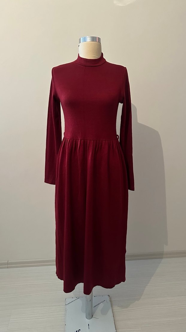 Bordo renk, yüksek yakalı ve uzun kollu, vücuda oturan bu uzun elbise, yumuşak ve sıcak kumaştan yapılmıştır. Minimalist ve çağdaş tarzıyla romantik akşamlar için uygundur.