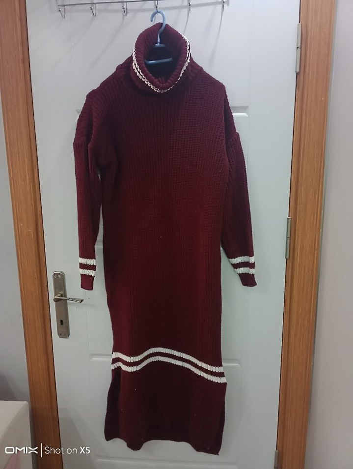 Bordo renkte, yüksek yakalı ve uzun kollu triko uzun kadın kazak. Manşet ve etek kısmında beyaz çizgiler bulunur, rahat ve parlak görünüm sağlar. koli 3