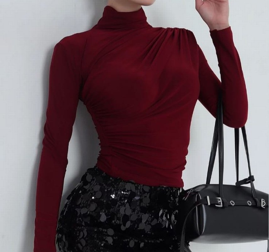 Bordo renkli, yüksek yakalı ve uzun kollu, drapeli kadın bluz. Viskon ve likralı dır. modern ve şık görünüme sahiptir. Model boy 173 kilo 54. Ürün boyu 50 cm mesaj atarak alınız.