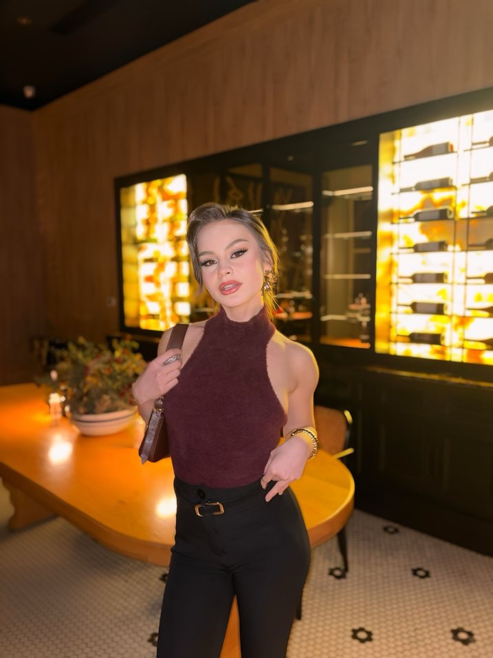 Bordo yünlü kumaştan yapılmış, yüksek yakalı ve kolsuz, vücuda oturan crop top. Parti ve sokak stili için uygun şık tasarım. Sadece 1 kere giydim
