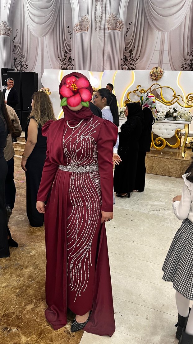 42 44 beden arası uygundur iki saat giyildi yeni Bordo uzun abiye elbise, yüksek yakalı ve drapeli tasarımıyla dikkat çeker. Önü desenli ve ışıltılı detaylı, askılı kolludur, düğünler için uygundur.