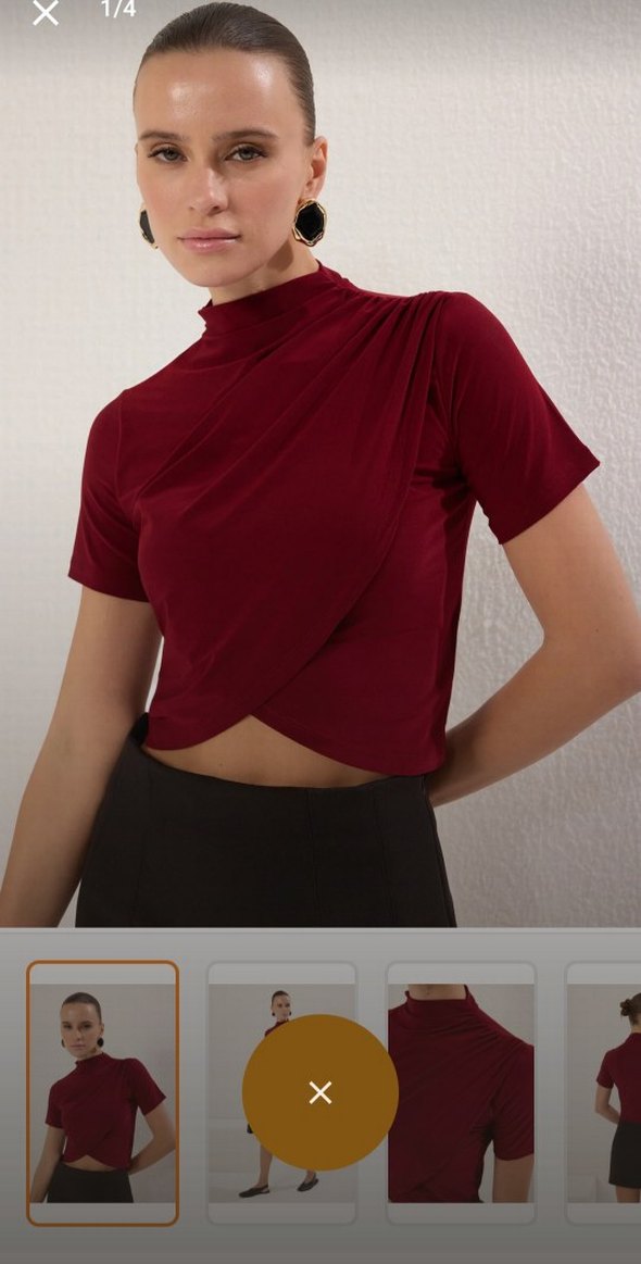 Bordo renkte, yüksek yakalı, kısa kollu ve drapeli tasarıma sahip, ince ve şık kumaştan yapılmış kadın bluz. Günlük kullanıma uygun.