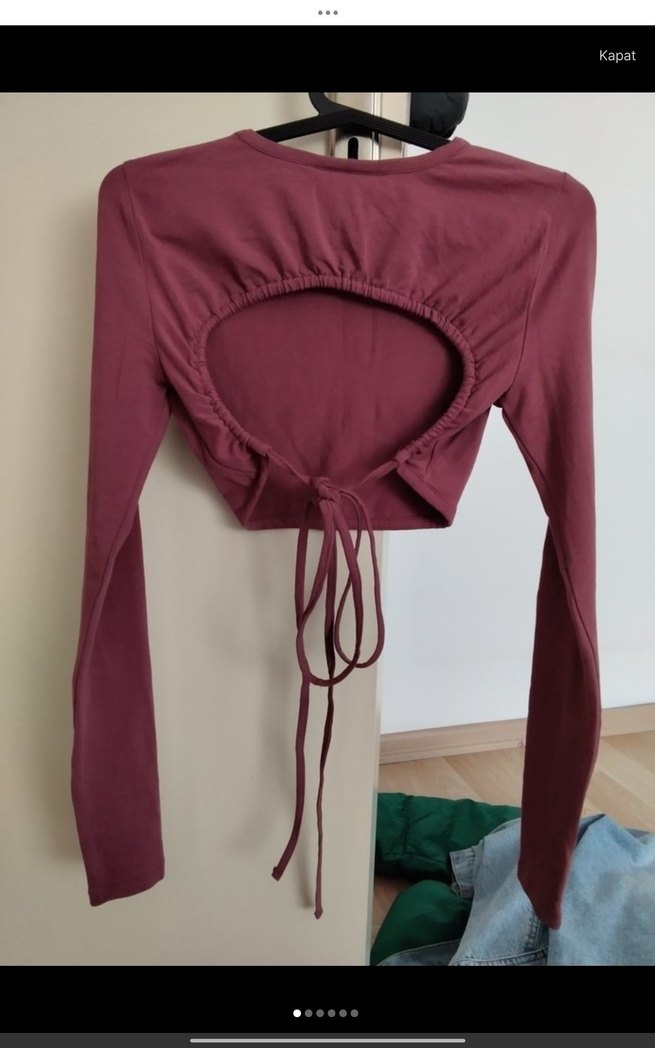 Bordo renkli, yüksek yakalı ve uzun kollu, drapeli açık sırt detayı olan, sentetik kumaştan yapılmış, dar kesim kadın bluz. Günlük sokak stili için uygun.