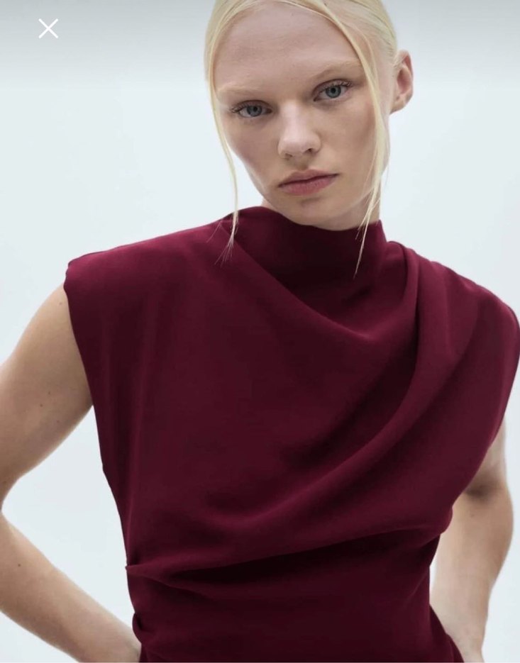 Bordo renkte, yüksek yakalı ve drapeli tasarıma sahip, kısa ve vücuda oturan mini triko elbise. Yumuşak ve parlak kumaştan üretilmiş, çağdaş ve avangart stilde günlük kullanıma uygun.