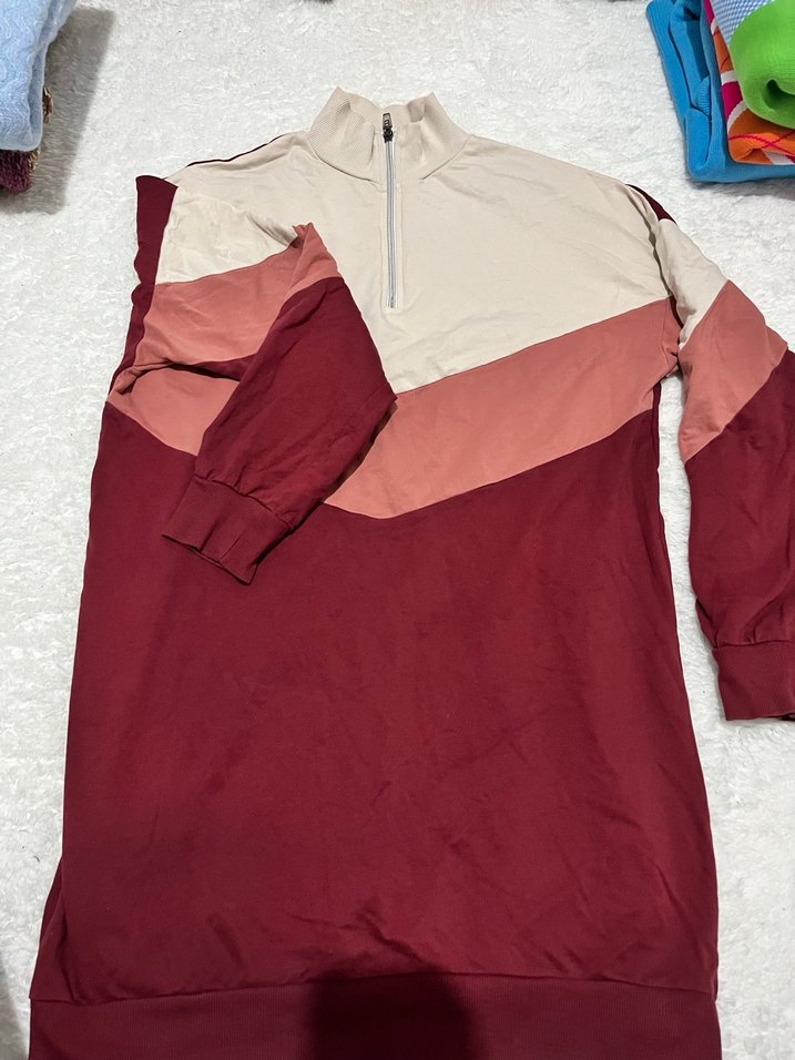 Bordo tonlarında renk bloklu, yüksek yakalı fermuarlı, uzun kollu ve bol kesim kadın sweatshirt. Yumuşak ve sıcak kumaştan üretilmiştir.