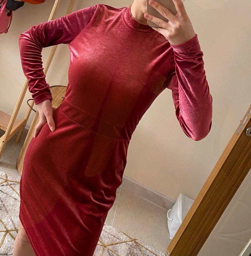Bordo renkte, yüksek yakalı ve uzun kollu, drapeli detaylı, parlak kumaştan yapılmış midi boy dar kesim elbise. 37 beden ama ben 36 beden olmama rağmen rahat giyebiliyorum