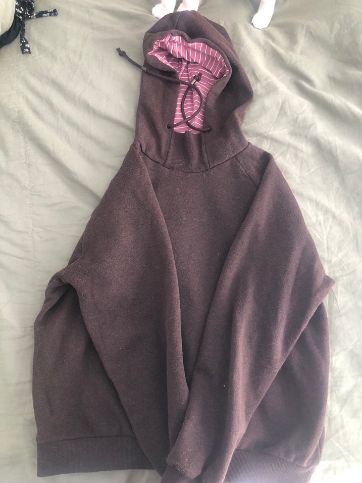 Kahverengi yüksek yakalı ve uzun kollu kadın sweatshirtü, yumuşak ve sıcak kumaştan, bol kesim ve midi boyda. Örgü dokusu rahat ve şık bir görünüm sağlar.