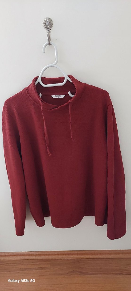 Bordo renkte, yüksek yakalı ve uzun kollu kadın sweatshirtü. Rahat kesimi ve yumuşak, sıcak kumaşıyla günlük kullanıma uygun minimalist tarzda.