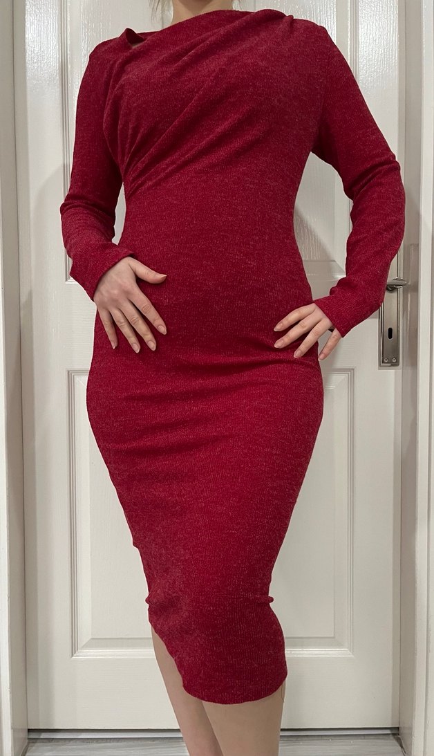 Bordo renkte, yüksek yakalı, uzun kollu, vücuda oturan midi triko elbise. Drapeli tasarımıyla hem rahat hem modern bir görünüm sağlar. ❤️ S ve m bedenlere uygundur