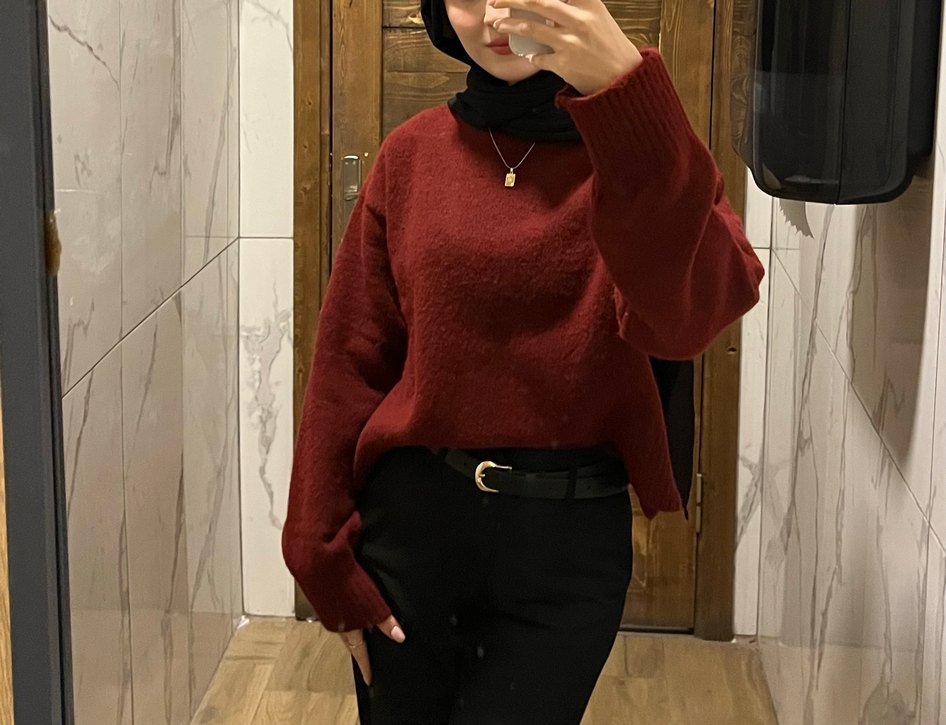 Bordo yüksek yakalı, uzun kollu yumuşak yün triko kazak. Salaş kesim ve normal boyda, trend günlük stil için uygun.