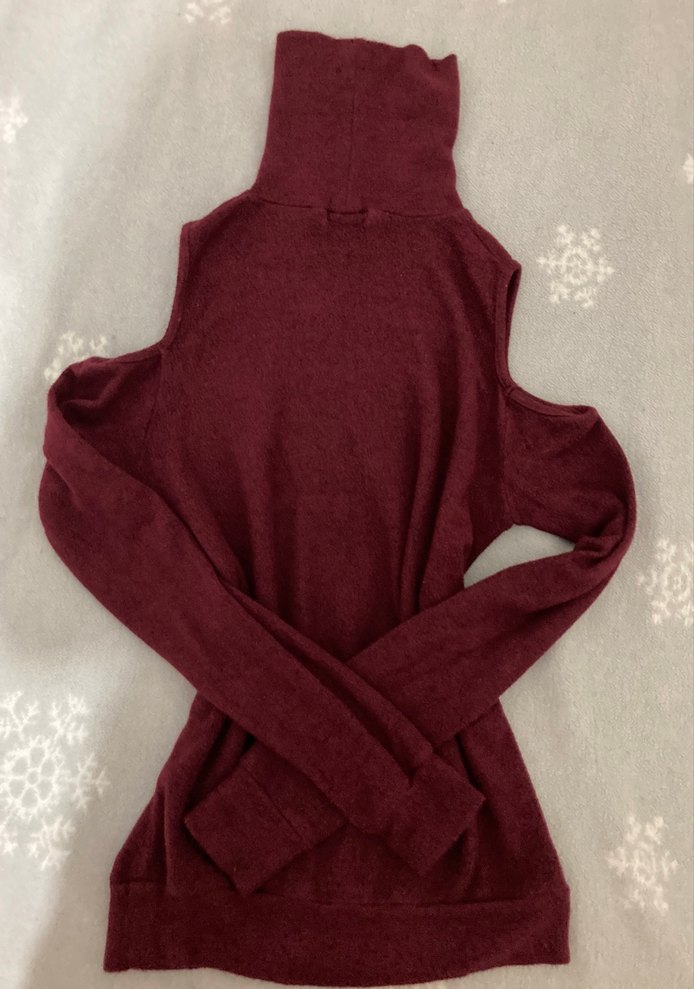 Bordo renkli, yüksek yakalı ve uzun kollu, omuzları açık triko kazak. Yumuşak ve sıcak dokusu, normal midi boyuyla rahat bir stil sunar.