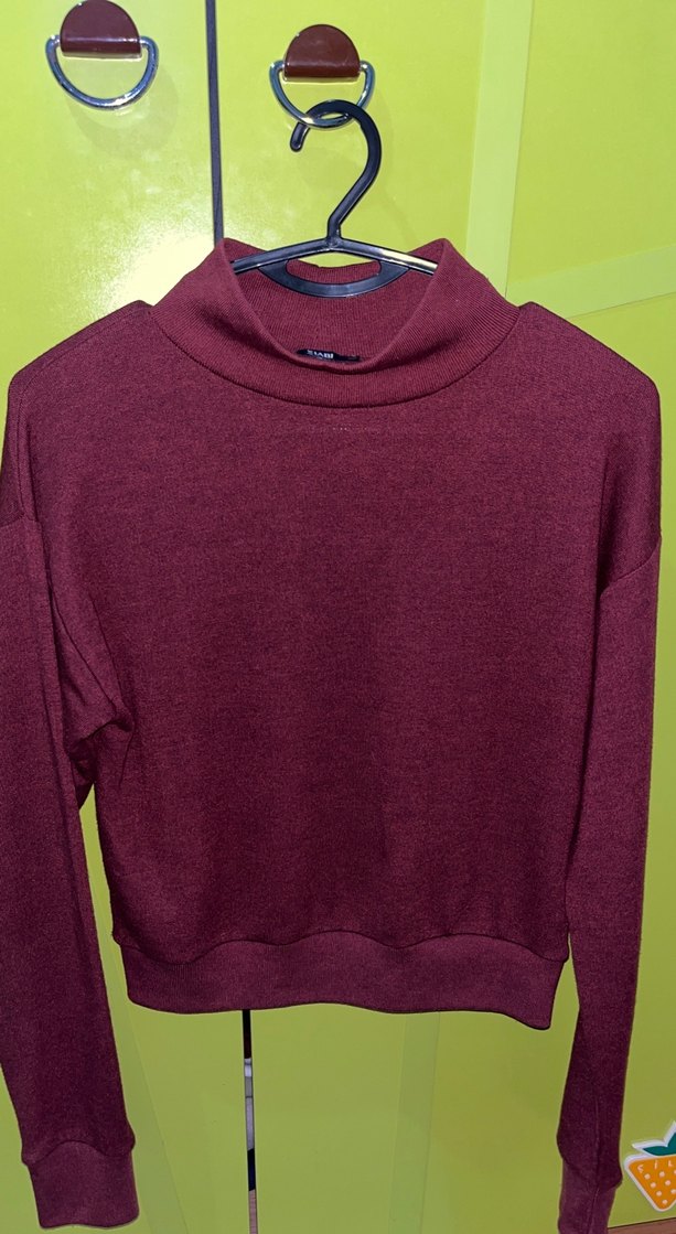 Bordo renkli, yüksek yakalı kadın triko kazak, uzun kollu ve bol kesimdir. Yumuşak ve sıcak dokuda örülmüş, günlük rahat sokak stili için uygundur.
