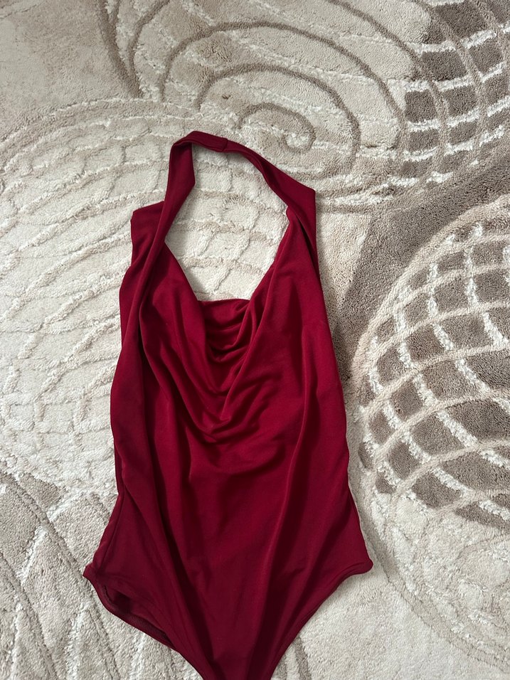 Bordo renkli, yüksek yakalı ve kolsuz, vücuda oturan bir body. Normal boyda ve desensiz, sade tasarıma sahip.