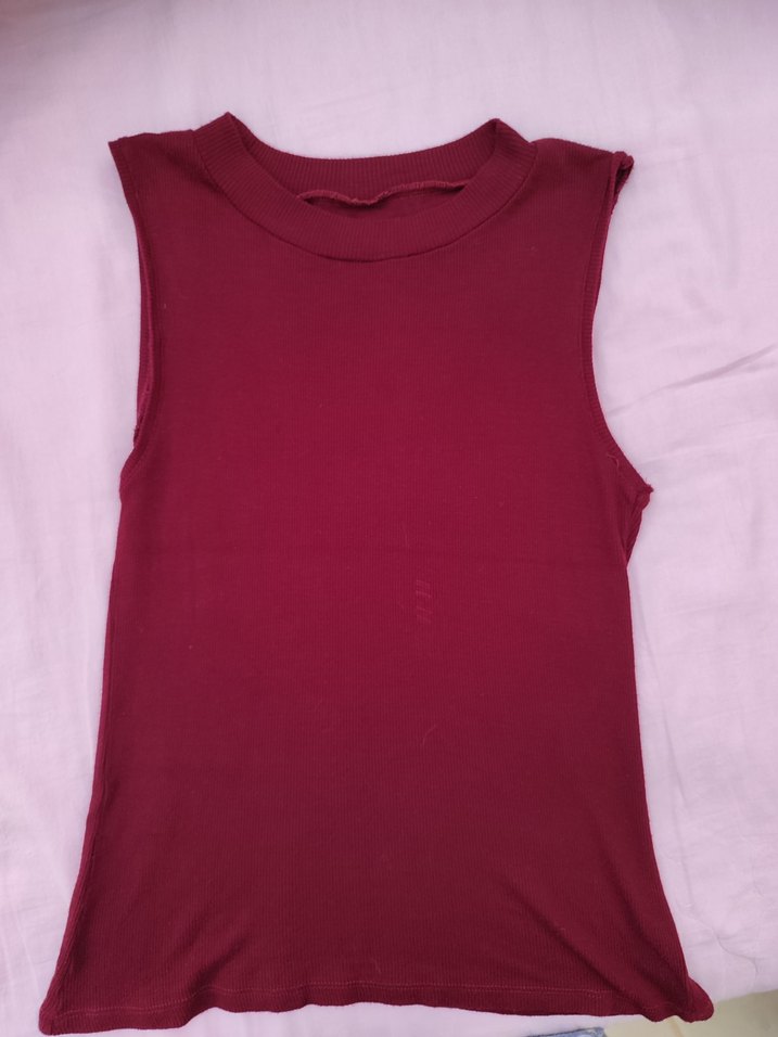 Bordo renk, yüksek yakalı ve kolsuz, vücuda oturan kadın bluz. Düz ve yumuşak sentetik kumaştan, günlük kullanım için uygun.