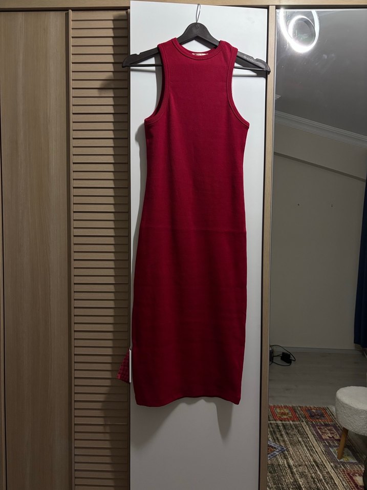 Bordo renkli, yüksek yakalı ve kolsuz uzun elbise. Vücuda oturan kesimi ve drapeli detaylarıyla minimalist ve çağdaş tarzda, günlük kullanıma uygun.