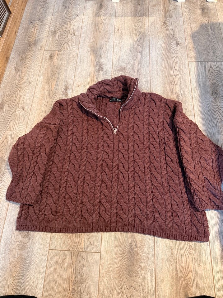 Bordo örgü kazak, yüksek yakası ve uzun kollu, bol kesimiyle rahat bir günlük kullanım sunar. Desensiz ve sade normcore tarzında.