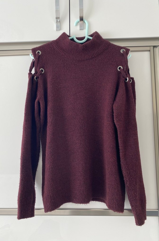 Bordo renkli, yüksek yakalı örgü kadın kazak, uzun kollu ve omuz dekolteli bağcıklı detaylara sahiptir. Salaş kesimiyle rahat bir kullanım sunar.