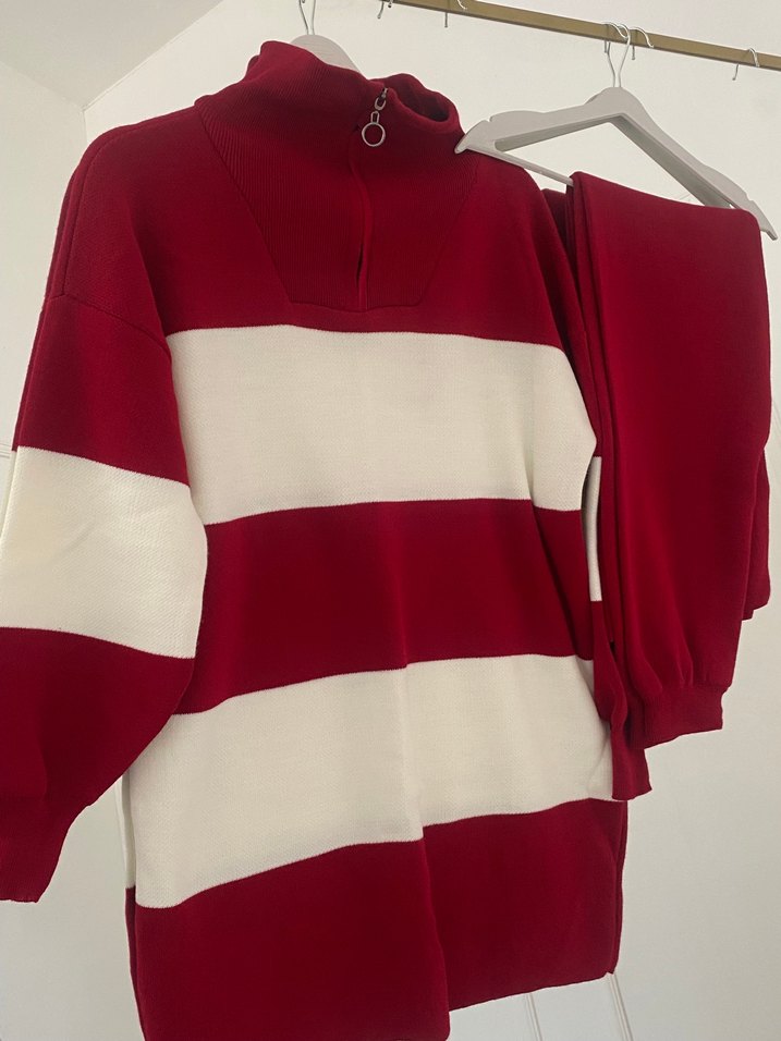 Bordo renkli, yüksek yakalı ve uzun kollu rahat kesim triko takım, geniş beyaz çizgilerle detaylandırılmış. Yumuşak ve sıcak kumaşıyla günlük sokak stiline uygundur.