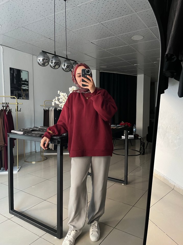 Bordo yüksek yakalı, uzun kollu ve salaş kesime sahip sweatshirt. Yumuşak ve sıcak kumaştan üretilmiş, günlük kullanıma uygun rahat ve şık bir parça.