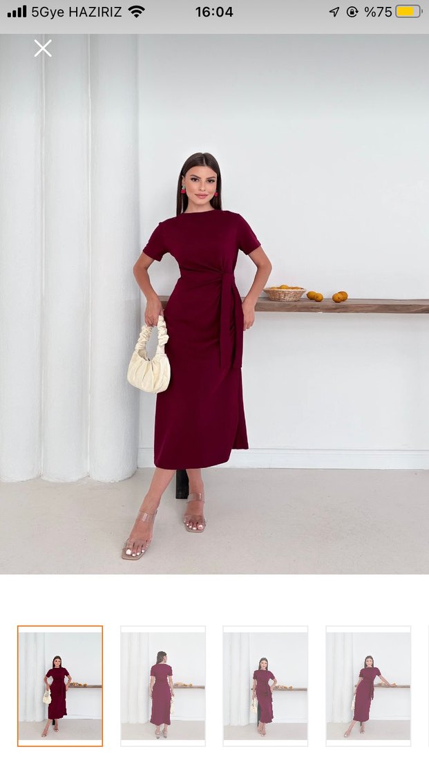 Bordo renkli, yüksek yakalı ve kısa kollu uzun elbise, satenimsi parlak kumaştan üretilmiştir. Rahat kesimi ve minimalist tasarımıyla ofis için şık ve zarif bir seçimdir.
