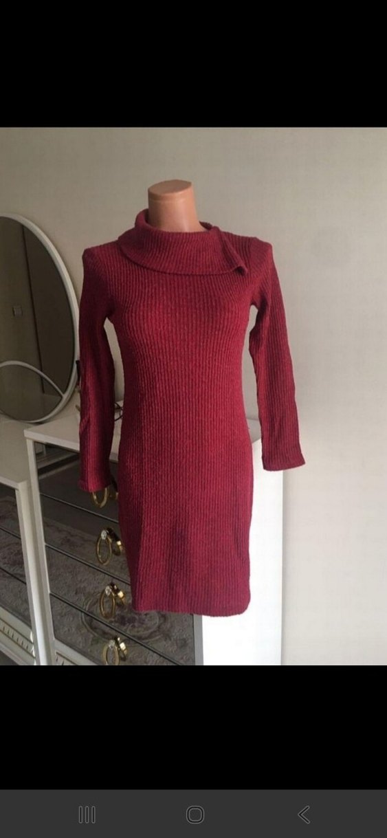 Bu bordo renkli, yüksek yakalı ve uzun kollu triko elbise, günlük kullanıma uygun, modern ve rahat bir görünüm sunar.