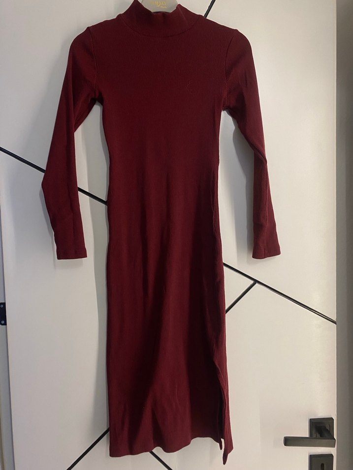 Bordo renkli, yüksek yakalı ve uzun kollu bu dar kesim uzun elbise, yan yırtmaç detayına sahip. Düz, sentetik kumaştan yapılmış, minimalist tarzda. Romantik akşamlar için uygundur. ❤️