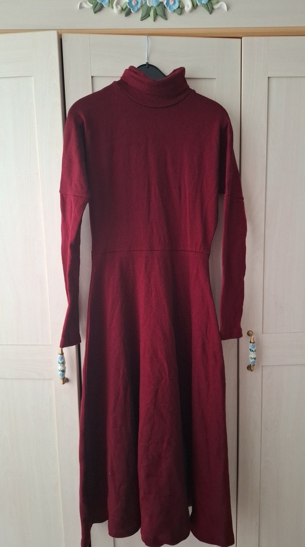 Bordo renkli, yüksek yakalı ve uzun kollu triko elbise. Yumuşak ve sıcak dokusu, vücuda oturan kesimiyle şık ve rahat bir seçimdir.