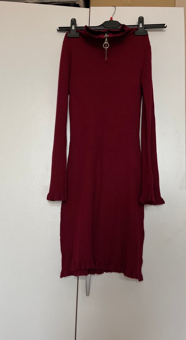 Bordo renkli, yüksek yakalı ve uzun kollu triko elbise, ofis için uygun, rahat ve şık bir tasarıma sahiptir. İnce ve uzun kesimiyle modern bir görünüm sunar. Mini boy iade değişim yok 1 kere falan giyildi