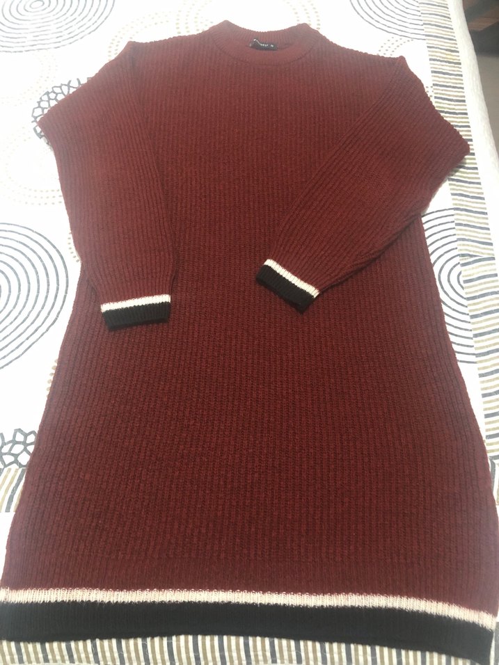 bisiklet yaka ve uzun kollu. Manşet ve etekte siyah-beyaz şerit detaylı, rahat ve şık.